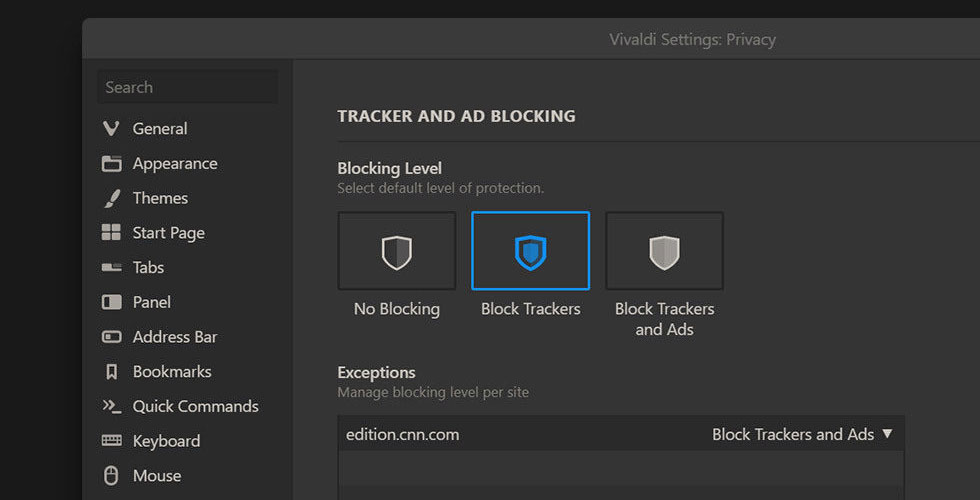 Vivaldi makes available three search engines for users concerned with tracking and personal privacy.