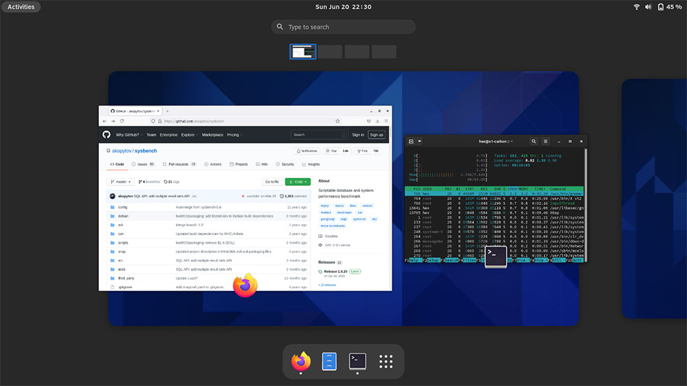 I wasn’t so lucky (by default, anyway). Hitting Super exposes a summary of all the current workspace’s windows, a more centrally located workspace indicator, an uncannily macOS-like dock, and Gnome’s omni-search bar.