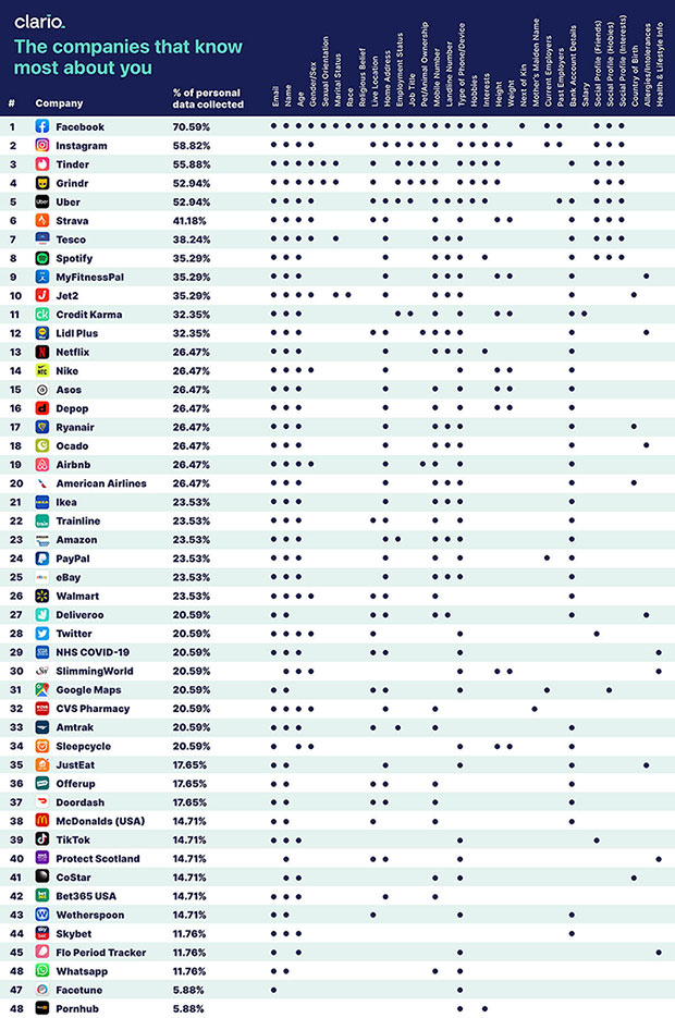 In fact, of the 32 items of personal information identified as collectible by Clario, only seven aren’t grabbed by Facebook — height, weight, mother’s maiden name, bank account details, salary, country of birth, allergies/intolerances, and health and lifestyle information.